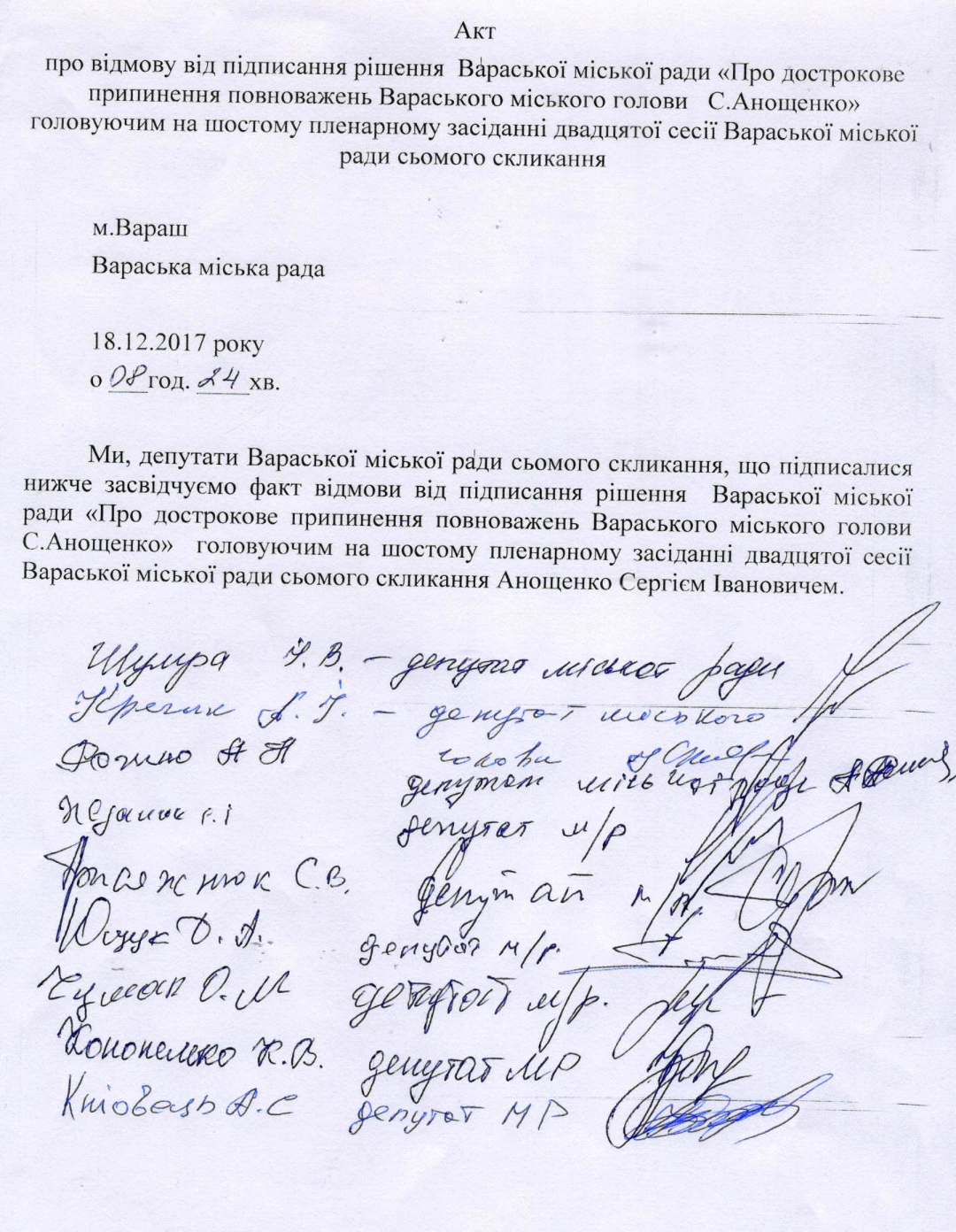 | Про дострокове припинення повноважень Вараського міського голови С. Анощенко |